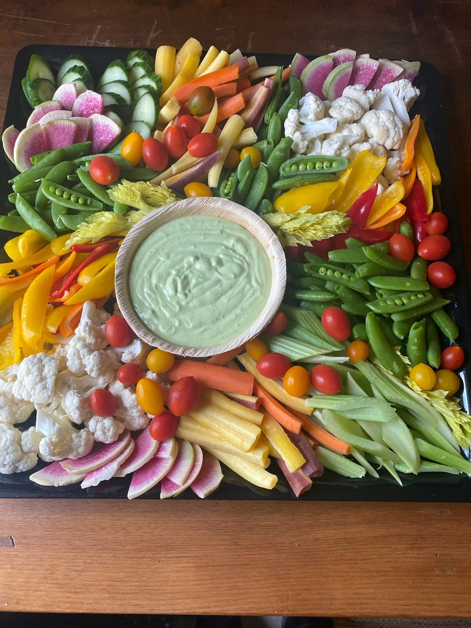 A colorful assortment of seasonal vegetables. Selections may include rainbow carrots, celery, cherry tomatoes, purple cauliflower, cucumbers, watermelon radish, snap peas, and mini bell peppers. Served with a house-made green goddess dip