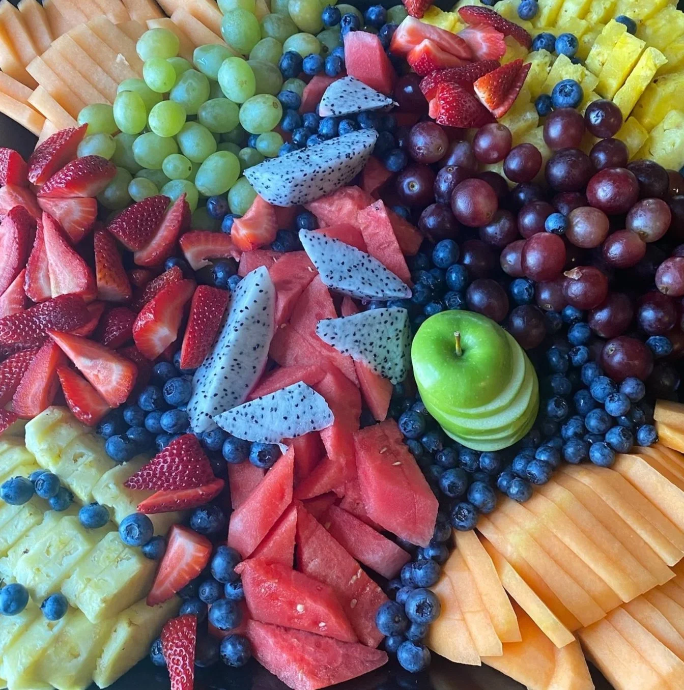 A vibrant display of fresh seasonal fruit, beautifully arranged and ready to enjoy. Selections may include grapes, cantaloupe, watermelon, pineapple, berries, and kiwi.